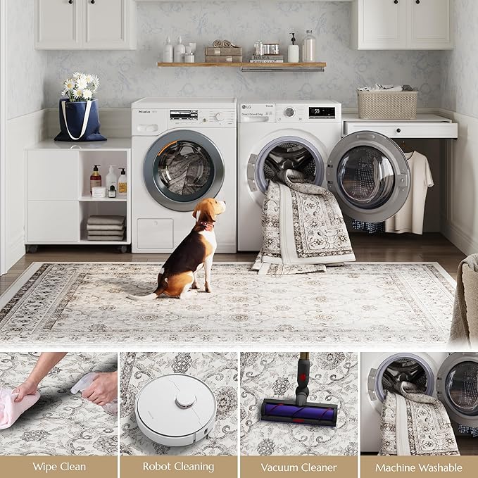 jinchan Round Rug 4ft Washable Circle Soft Rug - Low Pile Vintage 4'Round Indoor Beige Floral Print Stain Resistant Boho Carpet Ultra-Thin Non-Slip for Entryway Nursery Bedroom Dining Room Kitchen