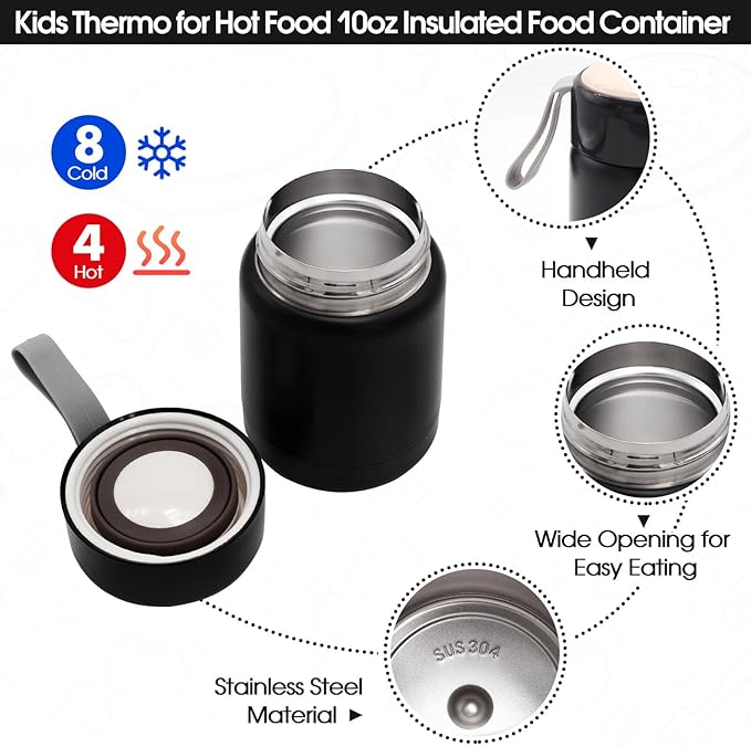 - π€ The food thermos measures 3.3 x 5.1 inches and the insulated food jar has a 10 oz capacity, big enough to hold your delicious soup or beverage. The insulated food jar is made of food-grade 304 stainless steel, which has good heat insulation and cold preservation properties.