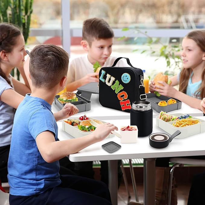 Insulated Lunch Bag for Boys Girls with 10oz Thermo, with 6 Compartment Bento Box, Black Nylon Preppy Lunch Box Adjustable Strap for Boy Girl Kids Teens School Travel Picnic