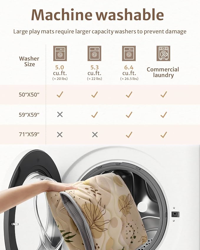 - Thicker & Larger - Our play mat is thicher than other brand, having enough cushion for the baby to roll around without hitting head. This 71 x 59 inch mat fits playpens with the same INSIDE dimensions, providing larger space for babies to play