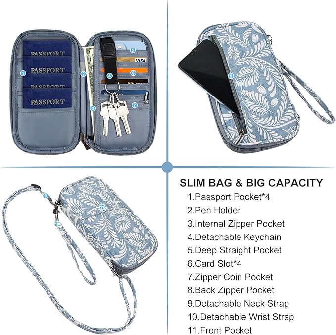 - ☘️[ FRIENDLY DESIGN ] The travel wallet especially designed with detachable neck and hand strap which can make your hands free for writing or holding when travelling. Each passport holder features a handy exterior pocket designed to hold your mobile devices and some small documents, looks non-bulky but slim and elegant. It makes your journey comfortable and wonderful.