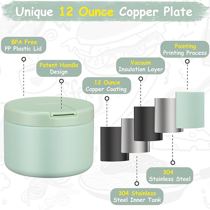 - Upgrade to 12 OZ Capacity: Bigger capacity can hold more food for children. The stainless steel soup thermal bottle is a double wall, with a vacuum in the middle, has good insulation performance, with a wide mouth design that is easier to clean.