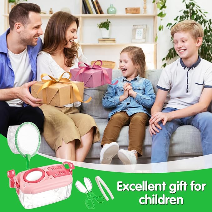 - 2Sets for Your Kids: We will provide you with two sets of bug catcher kits for kids, one green and one pink, each set contains an insect box (with an adjustable strap), a scissor-style capsule insect clip, a tweezer, and a butterfly net. A complete set of outdoor exploration kits specially designed for boys and girls aged 3-8 can allow your children to get close to nature, get to know and observe animals, and gain more knowledge.