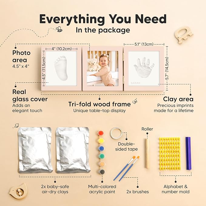 - 100% Safe Food-Grade Clay - Our baby picture frame features 100% baby-safe air-dry clay, perfect for preserving your baby prints. Our premium material ensures durability, the baby handprint and footprint maker will look flawless for years to come.