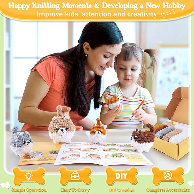 - 🧶【All-In-One Crochet Starter Kit】Auspicious beginning Valentine's Day crochet kit for beginners comes with everything you need to create adorable crochet animal kit: 4PCS Corgi dog pattern. 2 basic crochet manual, 4 different colored yarns, 1 needle, 4 eyes, 5 stitch markers, 2 crochet hook, 1 sessor, beginner's step by step video and stuffing. As packaging all the necessary tools together in giftbox. It's save much time and effort to search for each component individually.