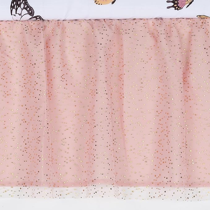 - The crib skirt features shimmering stars on tulle with a second layer in soft pink