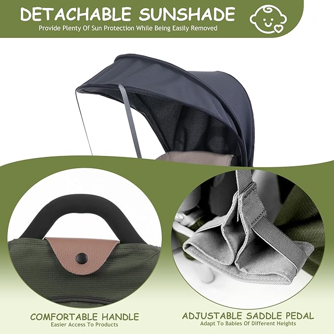 - AMPLE SPACE AND SAFETY: Our toddler carrier is equipped with an adjustable seat area, providing ample space for fast-growing babies. The advanced safety belt system protects the baby from falling, while the removable front and back pads provide additional comfort and easy cleaning advantages. The sun canopy provides effective sun protection for the baby, ensuring the comfort and safety of the baby during outdoor activities