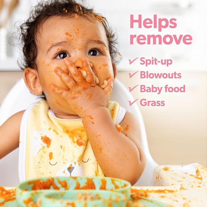 - WORKS ON ALL BABY & COMMON STAINS: Fights stains and odors from spit-up, blowouts, baby food, grass stains, the list goes on