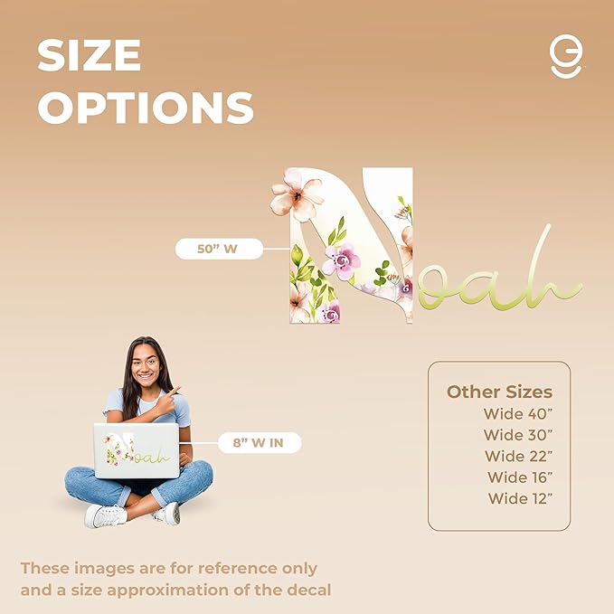 - ๐ MULTIPLE SIZE CHOICES: Tailor the name decal to your space effortlessly with multiple size options. Whether you want small flower stickers decoration or a big flower decor piece for your wall, our range of sizes ensures the perfect fit for any wall in your girls room. We believe in offering flexibility. Explore our vinyl letter stickers collection with various size options: Wide 8", Wide 12", Wide 16", Wide 22", Wide 30", and Wide 40".