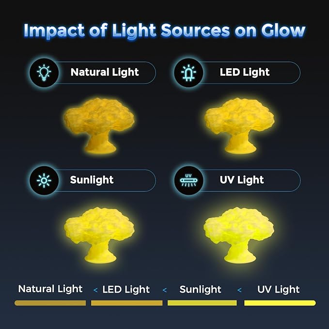 - Exceptional Glow Effect - This glow-in-the-dark PLA absorbs light and emits a soft glow in the dark. The brightness lasts for up to 5-100 minutes, with a 310% enhancement in brightness compared to standard glow-in-the-dark materials, providing a brighter and longer-lasting glow.