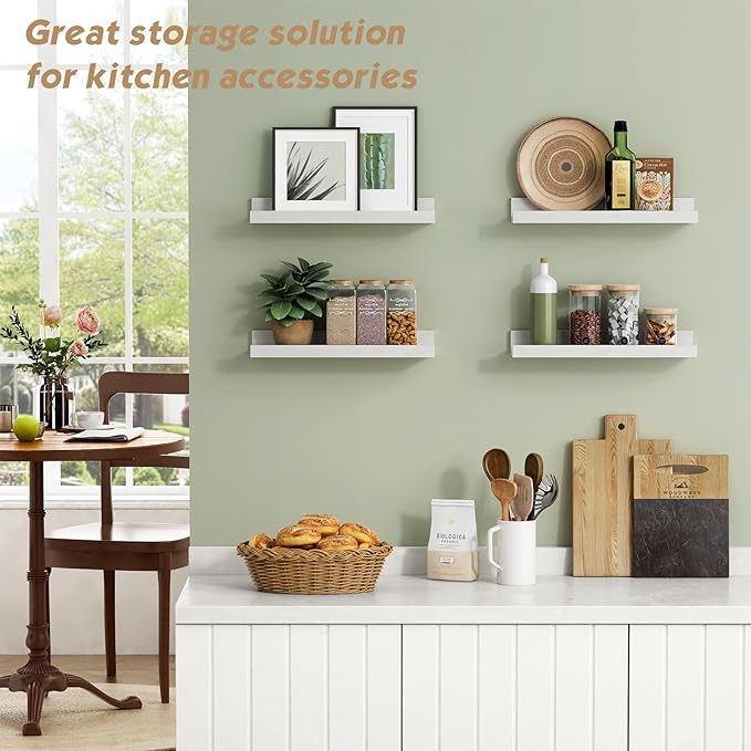 - 【Perfect solution for your walls】The nursery floating shelves with lip is SAME SIZE as each other (W 16" x D 4.5" x H 2.2") and is such an easy way to display photo frames without making lots of holes in your walls. The picture ledge shelf set of 4 are crafted from Paulownia wood which are lightweight yet proportionately strong, sustainable real wood. They come fully assembled and all mounting hardware is included in the package. Sturdy enough to hold up to 20 lbs weight with proper installation.