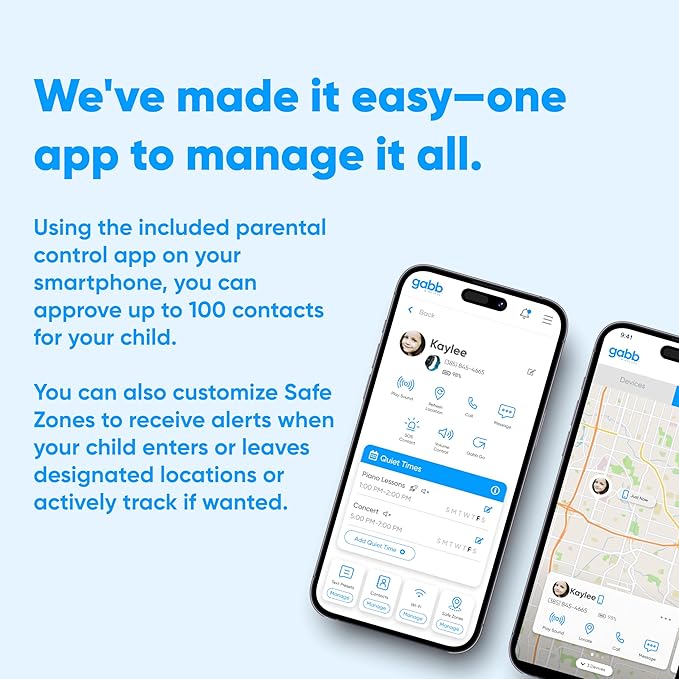 - Parental Control App: MyGabb app puts you in charge to approve contacts, monitor kids text messages, track your child's location with GPS, receive SOS alerts, schedule Focus Time for school, create Safe Zones, and more. Tailor the experience to your child's needs.