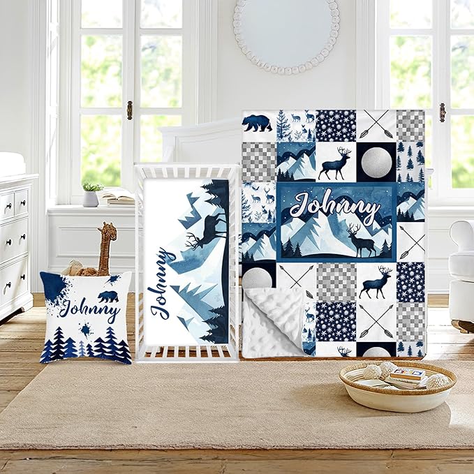 Custom Crib Bedding Set - Woodland Animals Design Personalized Name Baby Nursery Bed 3 Pcs Set - Chic Soft Blanket with Dotted Backing, Sheet, Pillowcase for Newborn Girls Boys Gifts Color10