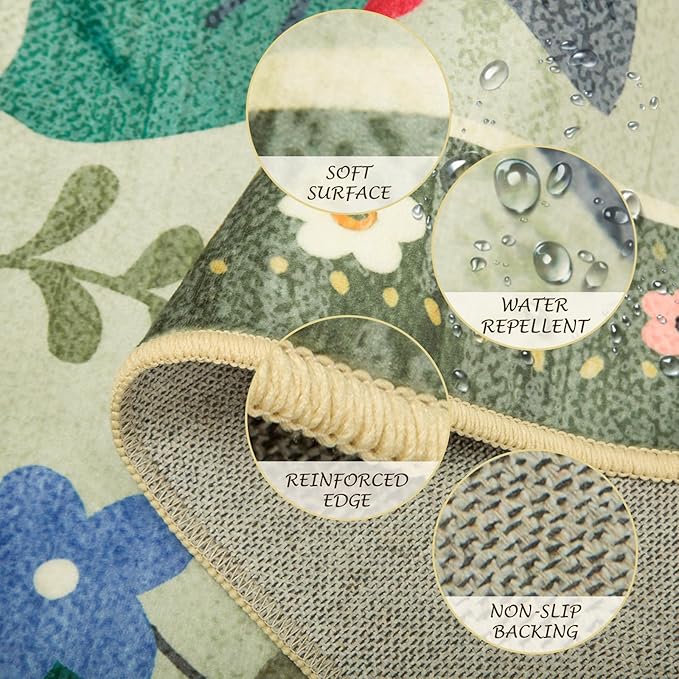 Floral 5x7 Area Rug Machine Washable Soft Print Boho Carpet Non Slip Doormat Low Pile Flower Area Rugs for Living Room Bedroom Nursery Kitchen Dining Room Indoor-Light Green