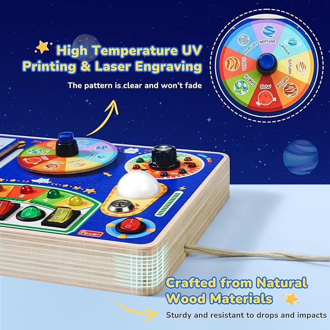 - Interactive Wooden Switch Board: Designed for toddlers who love switches and LED lights, this toddler busy board features different switches, each linked to a unique LED. The brightness is perfectly adjusted to be comfortable for young eyes, not too bright or dim