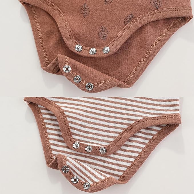- Bodysuit and Pants Set Design 1: Bodysuit has three metal snap buttons at the bottom for easy changing. The pants have elastic and shrinkable cuffs for easy play