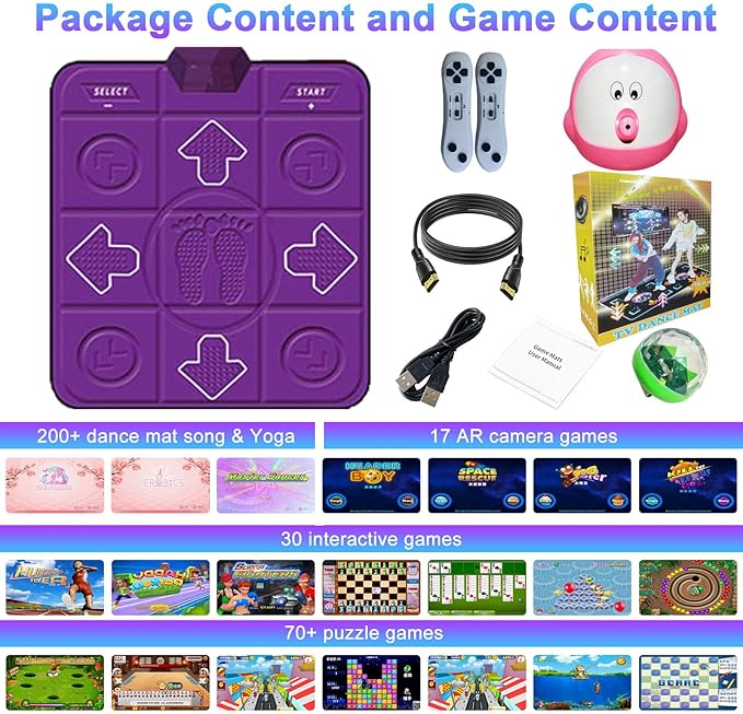 - 【Rich Dance and Games 】The Dance Mat game includes 5 modes, it has 200+ dance mat games, 18 camera AR sports games, 30 interactive sport games, 90+ gamepad puzzle games,10+ sets of yoga and aerobics tutorials. Games include tennis stars, table tennis and other casual games; fruit ninja, undersea adventure and other camera games. YRPRSODF dance mat really get exercise in recreation.