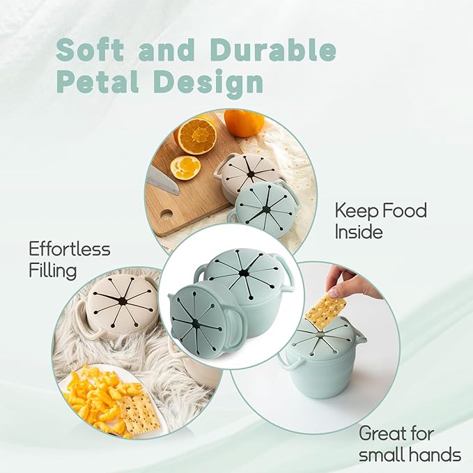 - Spill Proof and Convenient: These silicone snack cups for toddlers feature a flexible, petal-like opening to prevent spills and allow easy access to snacks. Their collapsible design makes them good for travel and storage.