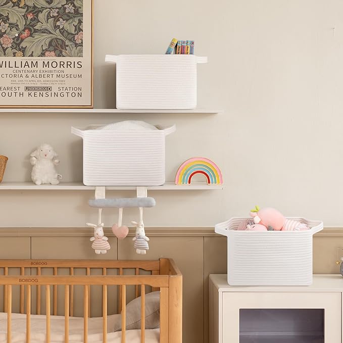 - Sturdy & Long-lasting: Made of high-quality natural cotton rope, these woven baskets are exceptionally durable & sturdy and firm enough in regular use. They can keep their shape even with heavy use. Each nursery basket with handles for easy carry