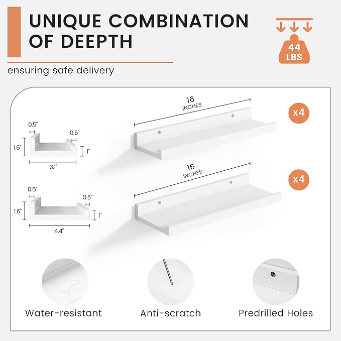 - 【Versatile and Multi-Functional】These shelves aren’t just for photos! FLYJOE ledge shelves can be creatively used as kids' bookshelves, display shelves for collectibles, spice racks in the kitchen, or even over-the-toilet storage in the bathroom. Their adaptability makes them a practical choice for any room in your home