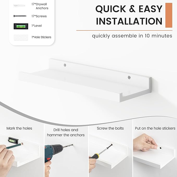 - 【Easy to Install】FLYJOE picture ledge shelves are quick and easy to install! Each set comes with pre-drilled holes and all necessary hardware, including a mini level for perfect alignment. With simple instructions, you can have your shelves up in minutes, allowing you to start decorating right away