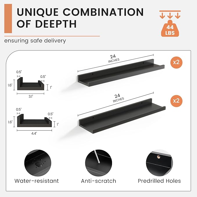 • 【Picture Ledge Perfect for Display】FLYJOE picture ledge shelves for wall turn your walls into a stunning photo gallery! These spacious shelves are ideal for showcasing a variety of picture frames in one secure place. With a thoughtful protective lip, you can display everything from photos to collectibles without worrying about them falling off