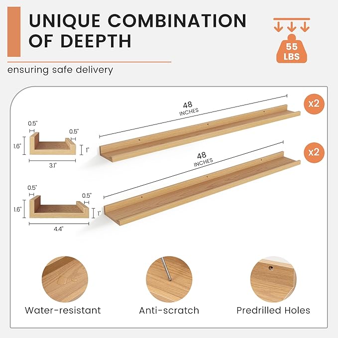 Floating Picture Ledge Shelves for Wall Set of 4, 48 Inch Wall Shelves with Lip Long Large Nursery Book Shelf for Toys Storage Kids Bookshelf Wall Mounted Living Room Bedroom Decor Frames