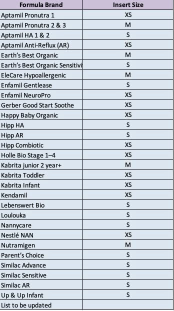 - Universal Compatibility - Works with virtually all formula brands and all bottles. Davijo comes with 4 interchangeable inserts that have different outputs, as the formula scoop measurments varies slightly between the different brands. Choose the correct insert for your prefferd brand. Please see out recommandation Chart to select the correct insert.