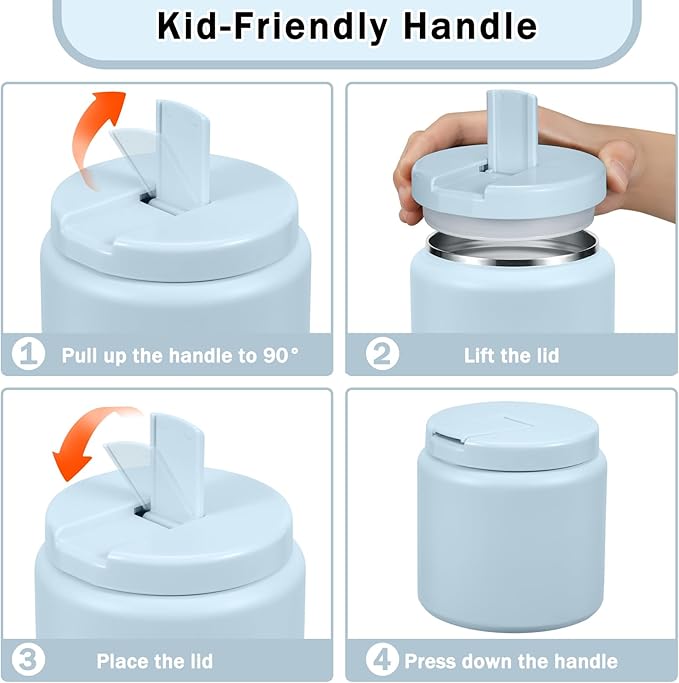 - Easy to Open: This thermos for hot food features a unique Buckle Structure design. Simply pull the handle to a 90° angle to easily open the lid. The handle is especially child-friendly, allowing little hands to open it with ease.