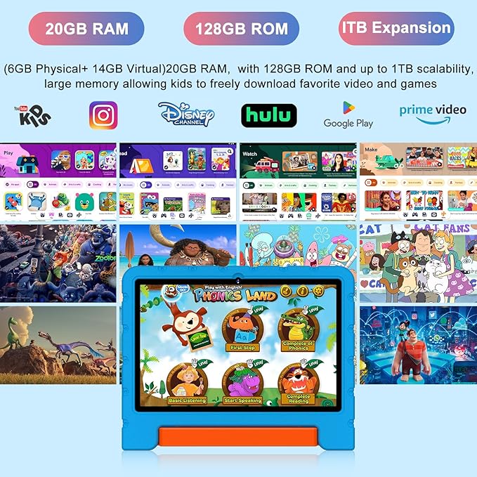- 【20GB (6+14) RAM and 128GB Super ROM & 6000mAh Large Capacity Battery】 20GB ( 6GB Original + 14GB Expanded Virtual ) RAM + 128GB ROM (SD card expandable up to 1TB), it is able to run various apps compatibly and smoothly, and store your child's favorite movies, photos and apps, such as Kindle,Instagram,Disney+ and other daily required apps directly from the pre-installed play store to meet your child's diverse learning and entertainment needs. Let kids enjoy math, language, music, painting in the game. Equipped with a large 6000mAh battery, giving your child a stable and continuous use experience.