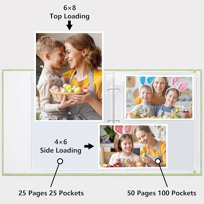 - Mixed Photo Size Storage: The family photo album measures 9.84”L x 8.86”W x 2.36”H. It includes 50 sheets (100 pockets) for 4x6 photos and 25 sheets (25 pockets) for 6x8 photos, allowing storage for up to 250 photos, with each pocket holding two