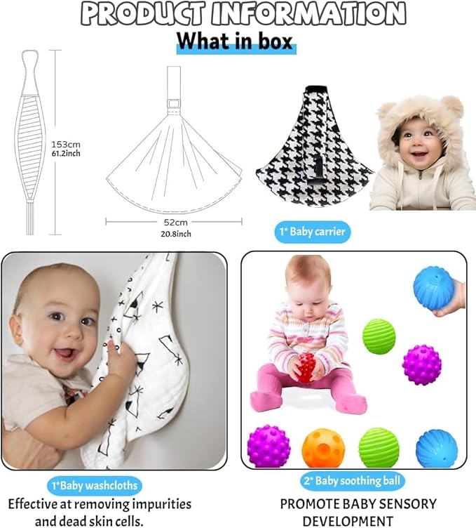 - 【What you get】 : 2 pcs different colors and shapes of toddler sensory ball, there are a variety of ways to play, colorful, more can attract the attention of the baby, 1pcs Baby Muslin Washcloths for Unisex 100% Cotton ,1pcs Convenient travel Baby Sling. is the holiday, Birthday, Thanksgiving and New Year's Christmas gift for your family and friends. Warning: This product is intended to be used with an adult for feeding and/or relaxation under direct adult supervision.
