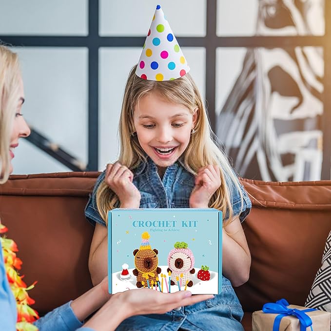 - 🐻【All-In-One Crochet Kit】 Everthing in box: enough yarn and stuffing, crochet hook x2, hot melt glue stick x1, knitting marker x5, yarn needle x1, scissor x1, Birthday Greeting Card x1. The crochet kit also comes with two manuals - 2pcs Capybara and 4pcs hats pattern and basic crochet instructions, as well as step-by-step video tutorials, which are perfect for beginners and kids to follow along with the videos and learn to crochet cute Capybara, red and pink strawberry/ Birthday/ Christmas hats.
