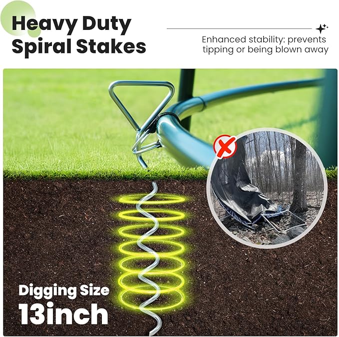 - γPowerful Fixed Helper: Spiral Nail StakesγExplore uninterrupted fun with our trampoline, designed to withstand the toughest winds. Outfitted with extra-long 13.4-inch spiral ground stakes, unlike the traditional short U-shaped pegs, our trampoline remains securely anchored. Enjoy peace of mind knowing it stays upright and damage-free, even in challenging weather. Perfect for compact outdoor spaces!