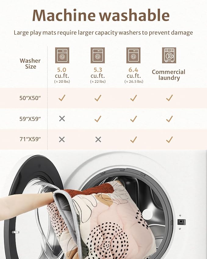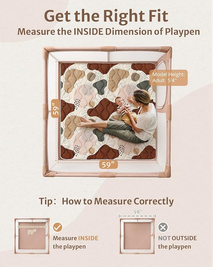 - Thicker & Larger - Our play mat is thicker than other brand, having enough cushion for the baby to roll around without hitting head. This 59 x 59 inch mat fits playpens with the same INSIDE dimensions, providing larger space for babies to play