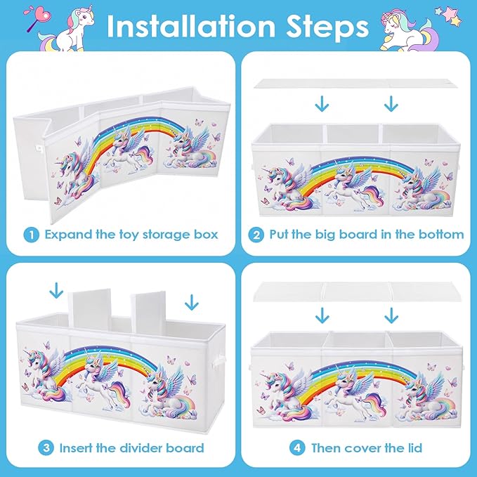 - 【Convenient Divider Design】 Our cube toy box is designed with a velcro flip lid, which helps to prevent dust from getting in, and there are two removable dividers in the center, which can be turned into different storage spaces, and large toys can be put, making it easy to reach for items.