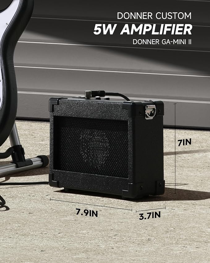 - COMPLETE BEGINNER’S PACKAGE:Open the box, and you’re ready to play. This beginner kits includes the DST-80 electric guitar, custom 5W amplifier, durable gig bag, capo, strap, extra strings, digital tuner, amp cable, picks, and access to free online lessons from Donner to help you grow and shine