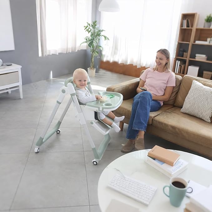 - Portable & Compact: Featuring lockable wheels for easy mobility, this high chair folds flat for convenient storage. It's ideal for city living, apartments, and small spaces, helping you keep your home organized and clutter-free