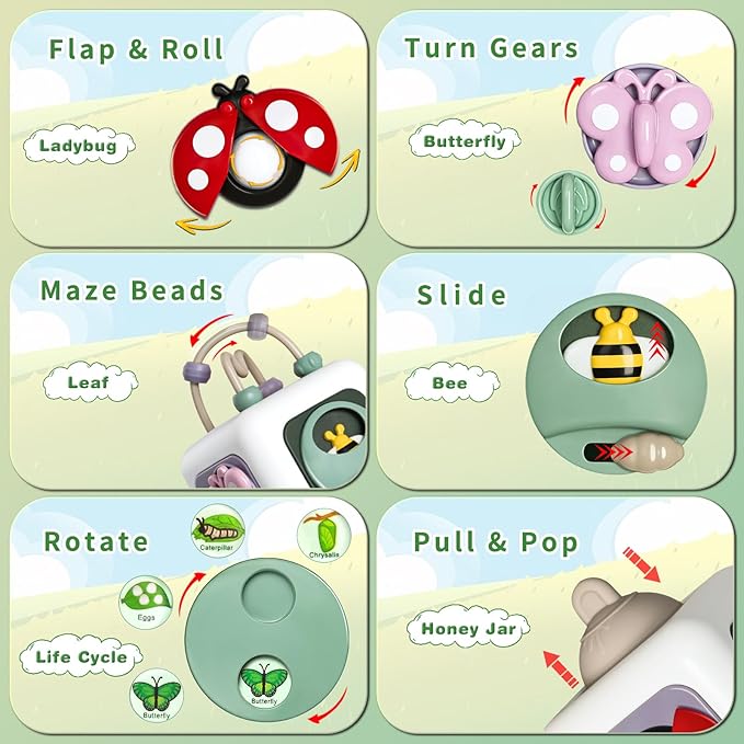 - 【6-in-1 Busy Toy】This activity cube is perfect for keep little ones busy. With a secret ball, peek-a-boo, turn gears, maze beads, life cycle and push & pull