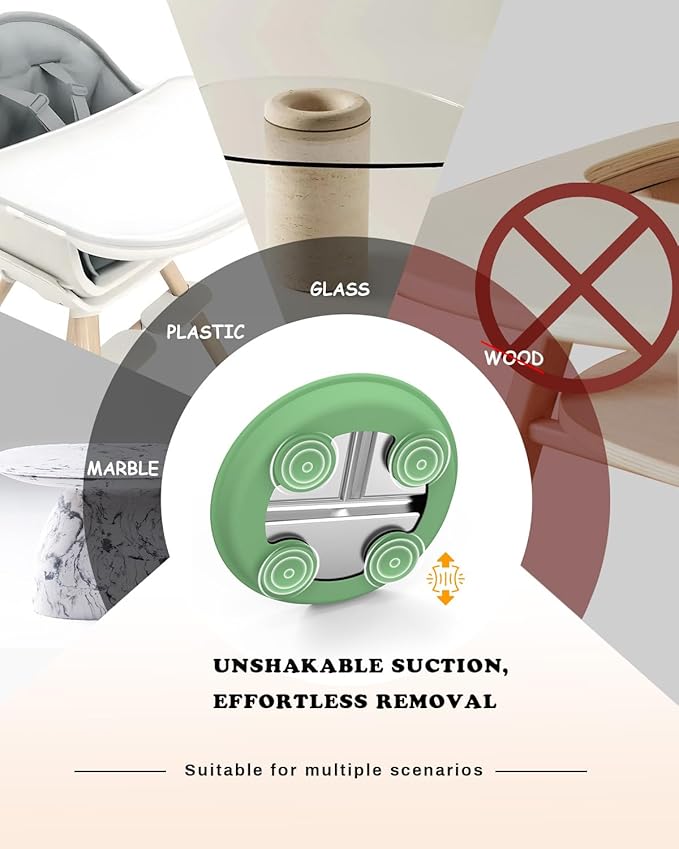 - Before You Buy: Designed for hassle-free use! The suction base securely adheres to clean, flat surfaces (like highchair trays, glass or polished tables) and highchairs with at least 9" inner width tray. Note: The 9" plate is intentionally spacious for balanced meals—measure your tray before purchase. Avoid rough wooden tables for optimal grip