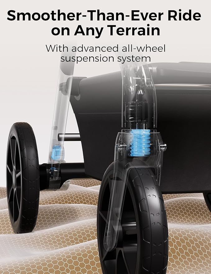 - Smooth and Comfy Strolling: No worries about waking baby on bumpy surfaces or over curbs thanks to the large 10-inch front swivel wheels, 12-inch rear wheels, and advanced suspension system with high-performance, shock-absorbing springs; adjustable handlebar with 5 height positions makes pushing comfortable for parents of different heights; innovative braking system protects shoes from scuffs and stains during operation