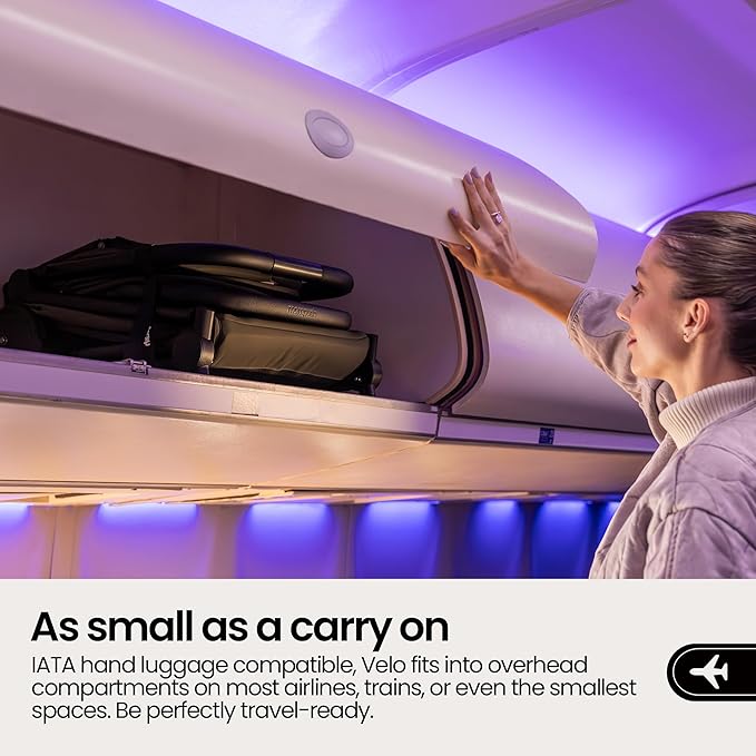 - Overhead Friendly: IATA hand luggage compatible, the Velo fits into overhead compartments on most airlines, trains, or even the smallest spaces. Ultra-compact fold: 17x8x20 in
