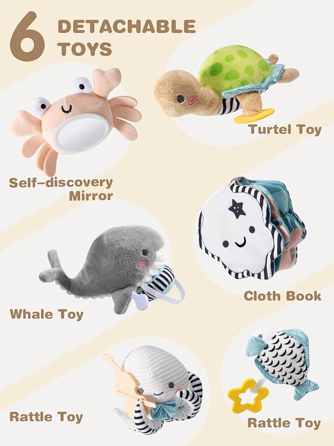 - Stimulates Sensory Development: The 6 removable marine animal accessories of our play gyms for 0-6 months fit perfectly on a variety of baby items where toys can be hung. Includes cloud, star and seahorse toys for auditory awareness training; crab and cloth books for visual awareness training; and whale and sea fish for tactile awareness training. Each of these toys of the activity mat for babies 0-6 months can improve baby's awareness of the outside world in different ways