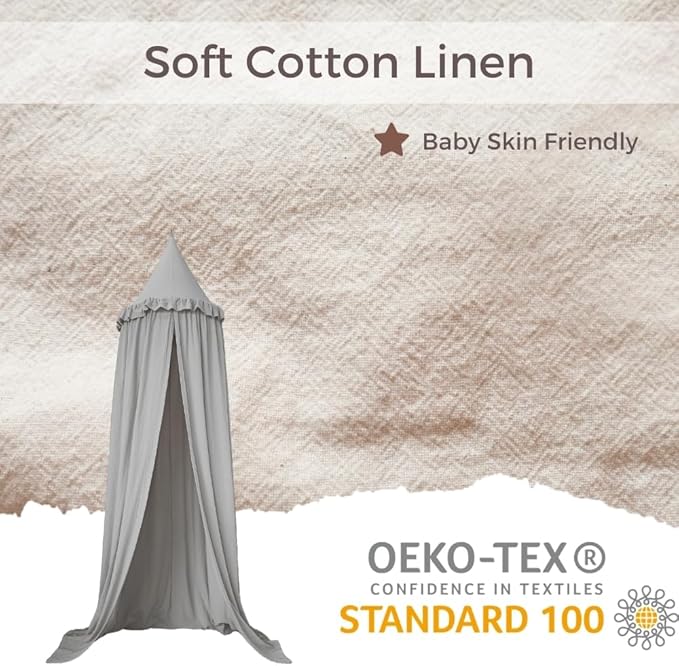Wonder Space Kids Bed Canopy with Ruffles, Lace Frilled Cotton Tent Net, Pastel Neutral Colors for Boys & Girls, Nursery Room Baby Crib Hanging Curtain Mosquito Net Children Reading Nook Decor (Grey)