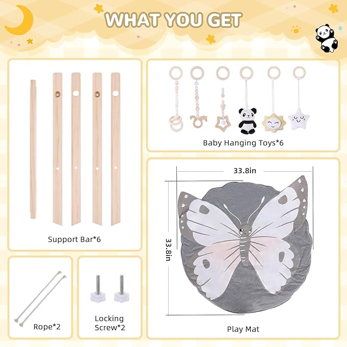 Wooden Baby Play Gym with Mat, Foldable Baby Activity Gyms with 6 Sensory Hanging Panda Toys, Tummy Time Baby Infant Toys (Butterfly)