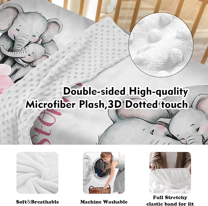 Personalized Baby Crib Bedding Set for Baby Girls, Pink Flower Elephant Design Custom Name Baby Crib Sets 5-Pcs, Toddler Double Layer Blanket Fitted Sheets Changing Pad Cover Rug Wall Art Set
