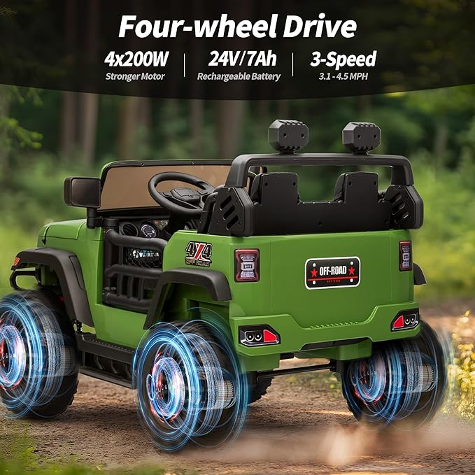 2 Seater Ride on Toy Car for Kids, 24V 4WD Ride-on Truck Kids Electric Car with Remote Control, 4x200W Motors - Army Green