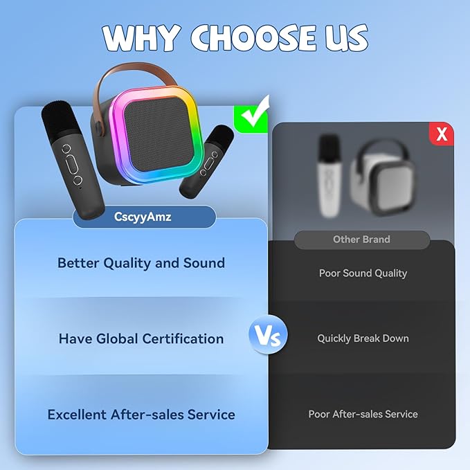 - 【Take the Party Anywhere】10H Playback(USB-C rechargeable) beats 90% of mini karaoke machines.Small and light design is convenient for you to take anywhere.And you can safely let your children play mini karaoke machine by themselves(meets toy safety standards).We promise provide replacement for any product damage within 5 years.