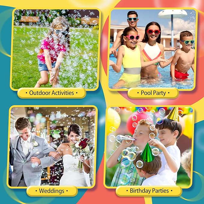 - Ideal Gifts for Any Occasion - The toddlers bubble maker comes in a beautifully packaged box with complete accessories . It is the perfect gift for kids toddlers over three years old. The bubble gun blaster also makes a great bubbles toy bag for these indoor and outdoor occasions, perfect for theme parties, carnivals, birthday parties, camping trips, Halloween, weddings, school classrooms, Easter baskets, outdoor water toy play activities, beaches, backpacking, backyard Bubble party etc.