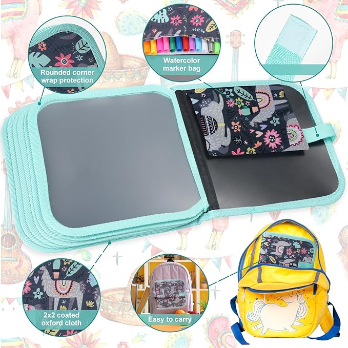 - ๐จKid's Road Trip Essentials--Kids Erasable Graffiti Book has sticky buttons on the outside to keep it in place and a pens pocket on the inside for 12 watercolor pens. Even in cars, planes and other means of transportation, kids can draw as much as they want.